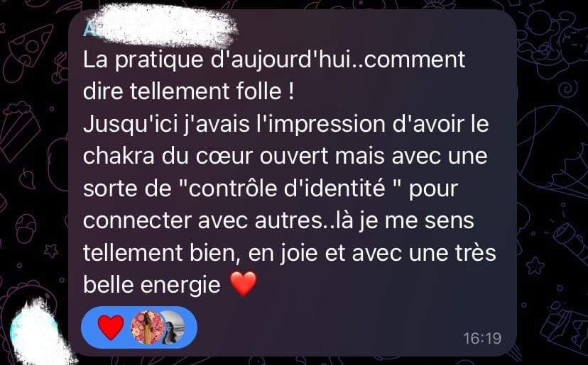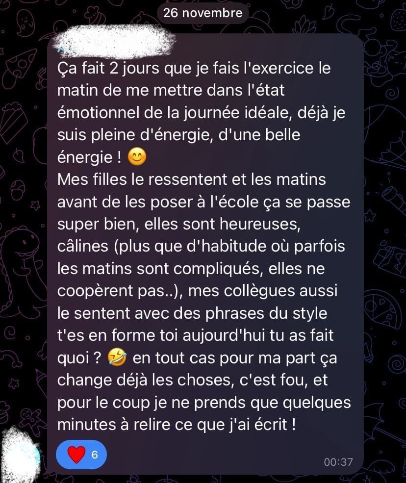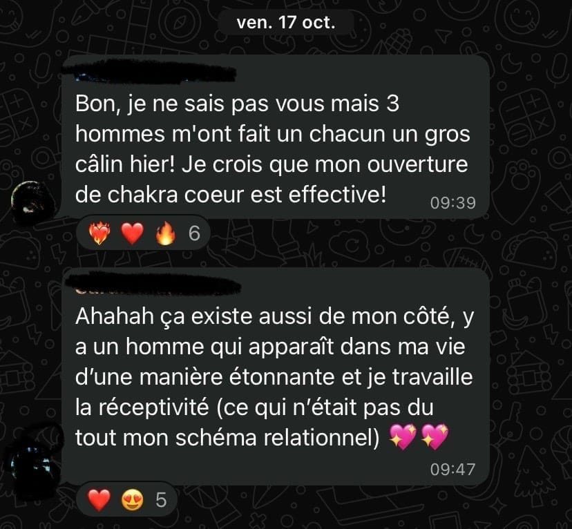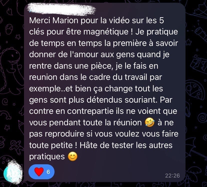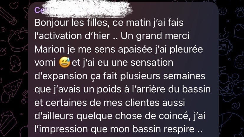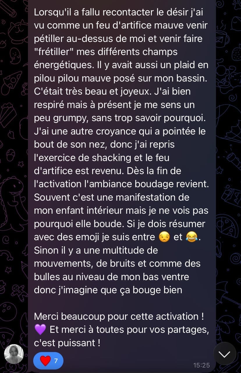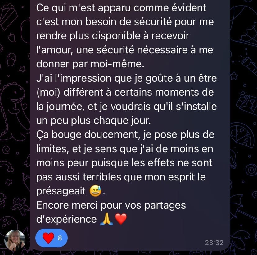 Un groupe privé Telegram pour partager tes prises de conscience, tes progrÚs, tes moments « wahou » et ton avancée avec les autres femmes du programme.