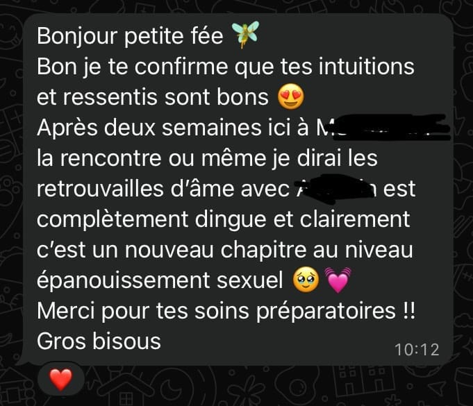 Ce programme dure deux semaines, durant lesquelles tu auras un accÚs quotidien à mon énergie, mes expériences, et les pratiques qui m'ont permis de connecter avec mon partenaire amoureux. Tout se déroule sur l'application Telegram. DÚs que tu auras accÚs au groupe Telegram, tout le contenu te sera disponible, et tu pourras avancer à ton rythme.